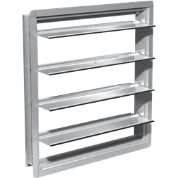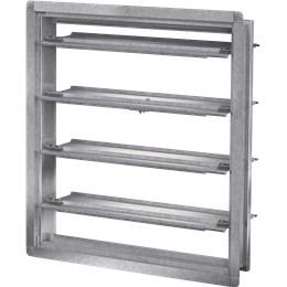 Pivoted backdraft damper for low-velocity systems. Horizontal mount allows vertical upflow; flangeless design opens with airflow and closes to prevent reverse flow.