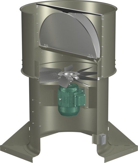 The AX roof-mounted fan is an expanded capacity direct drive axial exhaust model. This model has cast aluminum blades and hub assembly, heavy gauge spun curb cap to reduce inlet losses, a butterfly damper section for backflow prevention, and a windband section to protect the butterfly dampers from debris. Typical applications include clean air, fume exhaust, and spark resistant construction.