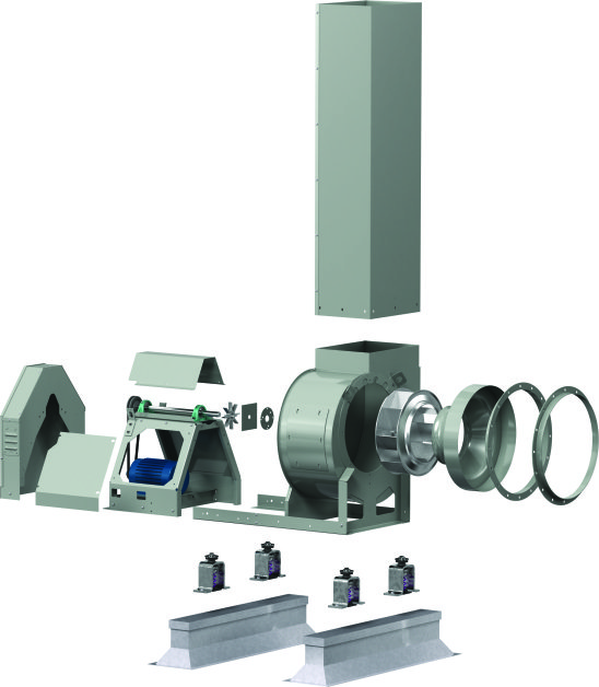Model FJC is a belt-driven, arrangement 10 unit available in either coated steel or galvanized finish construction. The unit has a compact footprint with motor and drives located under a common weather hood. The fan and stack assembly has been designed and factory tested to withstand a force of 34 PSF (equivalent to 115 mph) without the need for guy-wires. Typical applications inlcude manufacturing exhaust, medical instrument sterilization, and isolation rooms.