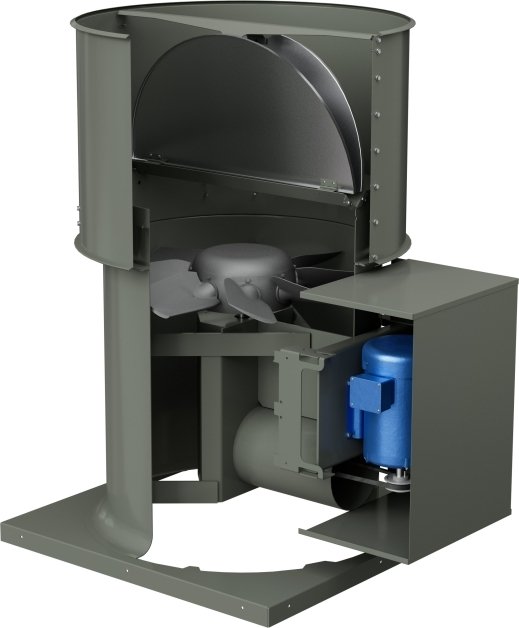 This belt drive axial exhaust fan has a welded housing, powder coating with cast aluminum hub and blades. Typical applications include clean air, fume exhaust, and spark resistant construction. Features include a belt tube and bearing cover protecting drives from airstream, butterfly dampers with a rolled edge for increased strength, and gasket covered edges for quiet closure.