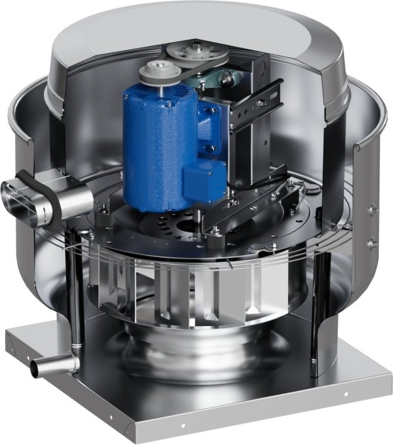 This belt-driven centrifugal fan is designed for roof or wall-mounted installations exhausting contaminated or grease-laden air. A single-piece, continuously welded spun aluminum housing enhances durability and corrosion resistance, while directing exhaust air away from the mounting surface to help protect the building structure and extend service life.