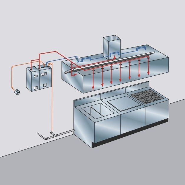 In an appliance-specific fire suppression system, nozzles and their placement are selected based on the exact type and configuration of cooking equipment being protected. By targeting only the appliances that present a fire risk, this approach provides a highly cost-effective solution without overdesigning the system. Stainless steel agent tank enclosures enhance durability and corrosion resistance, while flexible agent distribution allows precise routing to match the kitchen layout—supporting reliable, application-specific protection.
